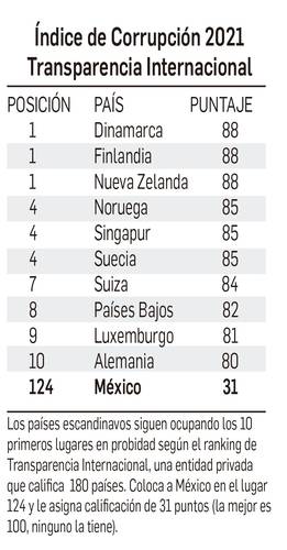 Transparencia Internacional en su último reporte correspondiente a 2021 volvió a reprobar a México en materia de probidad. Le puso la misma calificación que el año anterior: 31 puntos, la mejor es 100. No es consuelo pero desde que comenzó a darle seguimiento a nuestro país en el sexenio de Ernesto Zedillo, nunca lo ha aprobado. Esto se explica porque los sexenios de Zedillo (Fobaproa) a Enrique Peña Nieto (Odebrecht, estafa maestra) sobresalieron en corrupción. Pero desconcierta que ahora cuando el gobierno de la 4T ha asumido como meta prioritaria el combate a la corrupción, también repruebe. Fue desestimado el juicio y encarcelamiento de varios machuchones: Ancira, Lozoya, Rosario, Collado, etcétera ¿Quién es Transparencia Internacional? Es una entidad privada con sede en Europa y asegura que monitorea a 180 países. Tiene una representación en nuestro país: Transparencia Mexicana. Esta fue fundada por Federico Reyes Heroles en 1999, al calor de la fallida campaña anticorrupción de Fox. Sigue ejerciendo una gran influencia por conducto de Eduardo Bohórquez, que aparece como director.