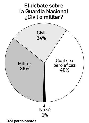 El presidente López Obrador anunció que emitirá un decreto a fin de que la Guardia Nacional (GN) dependa de la Secretaría de la Defensa Nacional. Esta decisión reforzaría su eficacia. El tema está en el centro de la atención de ciudadanos, académicos, líderes políticos y sociales. Tu opinión: la Guardia Nacional... ¿c1ivil o militar? Los resultados aparecen en la gráfica.