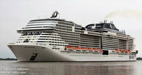 Cozumel, QR. El crucero MSC Meraviglia, con bandera de Bahamas, atracó a las siete de la mañana en la banda exterior de la terminal de cruceros Punta Langosta, en el puerto de Cozumel.