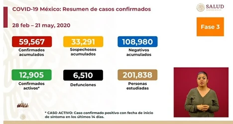 La Secretaría de Salud informó que el número de nuevos casos confirmados acumulados por Covid-19 en México en las últimas 24 horas se incrementó en 3 mil 329, para alcanzar los 65 mil 856 a nivel nacional, con lo que por primera vez se superan los 3 mil casos nuevos acumulados en un día, por lo que respecta a los decesos, se reportan 190 decesos más a los contabilizados este viernes, para llegar a los 7 mil 179.