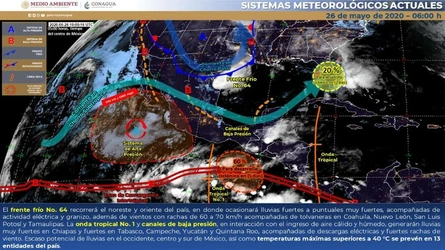Se esperan, durante la mañana, temperaturas mínimas de -5 a 0 grados Celsius en sierras de Chihuahua y Durango; mientras que por la tarde, las temperaturas máximas de 40 a 45 grados Celsius serán en Baja California, Campeche, Guerrero, Jalisco, Michoacán, el sur de Morelos, Nayarit, Oaxaca, el suroeste de Puebla, Sinaloa, Sonora, Tabasco, Veracruz y Yucatán, y de 35 a 40 grados Celsius en Baja California Sur, Chiapas, Chihuahua, Coahuila, Colima, Durango, el suroeste del Estado de México, el suroeste de Guanajuato, Nuevo León, el oriente de San Luis Potosí, el sur de Tamaulipas, Quintana Roo y Zacatecas.