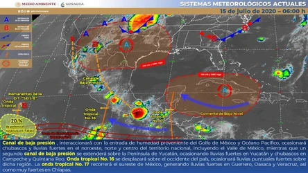 Ciudad de México. El Servicio Meteorológico Nacional (SMN) reportó la presencia de una nueva onda tropical sobre la Península de Yucatán, que eleva la posibilidad de precipitaciones y descargas eléctricas en Oaxaca, Chiapas, Veracruz, Tabasco, Campeche, Yucatán y Quintana Roo.