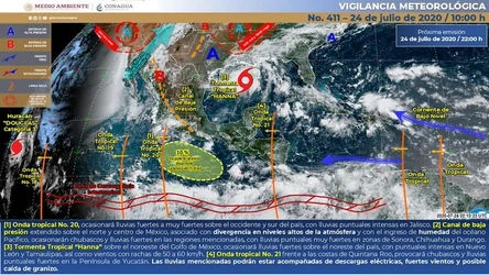 La dependencia de la Conagua también informó que la onda tropical número 21 se desplaza por el sureste de la República Mexicana, lo que ocasionará muy fuertes precipitaciones en Oaxaca y Chiapas, así como chubascos y fuertes lluvias en la Península de Yucatán.