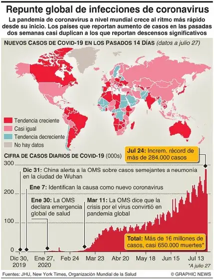 Desde el comienzo de la epidemia más de 16 millones 295 mil 350 personas en 196 países o territorios contrajeron la enfermedad. De ellas al menos 9 millones 171 mil 400 se recuperaron, según las autoridades.