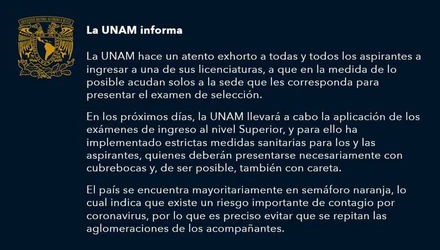 Debido a la emergencia sanitaria, la UNAM recomienda a los aspirantes que acudan solos al sitio del examen, a fin de evitar aglomeraciones en las inmediaciones de la sede.