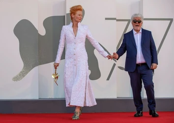 Mientras la diva australiana Cate Blanchett, presidenta del jurado, se limita a usar una azul y blanco quirúrgica, la célebre actriz británica Tilda Swinton, ganadora del León de Oro a la carrera y protagonista del corto de Pedro Almodóvar "La voz humana", lució en la ceremonia de apertura una ultramoderna dorada, con forma de mariposa, que recordaba a las tradicionales que se fabrican en Venecia para el carnaval.