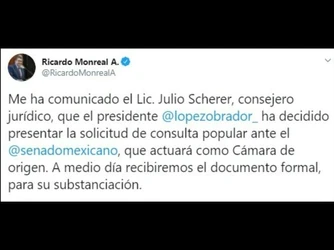 Reiteró que su compromiso es mandar obedeciendo y descartó que le afecte al gobierno la presentación de solicitud de la consulta. También, que haya una embestida de los ex presidentes “porque ellos saben que se debe de respetar la voluntad de los ciudadanos”.