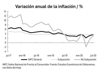Pese a la caída anual de 0.39 por ciento en el precio de los energéticos, la inflación no subyacente –que agrupa insumos propensos a variar– aumentó 4.10 por ciento. Esto se debió en particular al aumento de 12.76 por ciento en las frutas y verduras, de 4.49 por ciento en derivados de los animales y de 4.47 por ciento en las tarifas autorizadas por el gobierno.