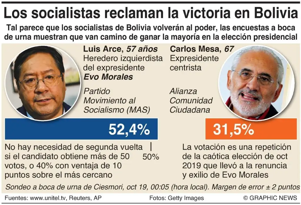 El triunfo de Arce marca el retorno al poder del Movimiento al Socialismo de Morales (2006-2019), un año después de su renuncia en medio de una convulsión social y acusaciones de fraude electoral.