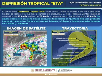 Durante la madrugada, el centro de la tormenta tropical Eta ingresó a tierra en las inmediaciones de Cedar Key, en la costa oeste de Florida, Estados Unidos de América, con vientos máximos sostenidos de 85 km/h y rachas de 100 km/h. No genera efectos en la República Mexicana, pero se mantiene en vigilancia.