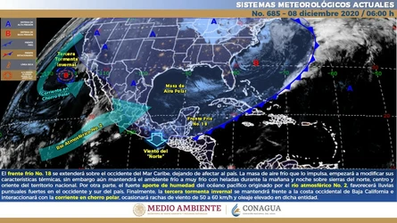 En el noroeste de Baja California, añadió, la Tercera Tormenta Invernal originará un nuevo frente frío, que en combinación con la humedad que arrastra el río atmosférico, provocará ambiente gélido y condiciones para la caída de nieve o aguanieve en sierras de Baja California, lluvias muy fuertes (de 50 a 75 mm) en Baja California Sur, el poniente de Chihuahua, el norte de Sinaloa y Sonora, y lluvias fuertes en Baja California y el noroeste de Durango.