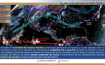 La masa de aire frío que acompaña al frente originará ambiente de frío a muy frío en gran parte de la República Mexicana, con heladas matutinas y nieblas sobre regiones del norte y centro del país.