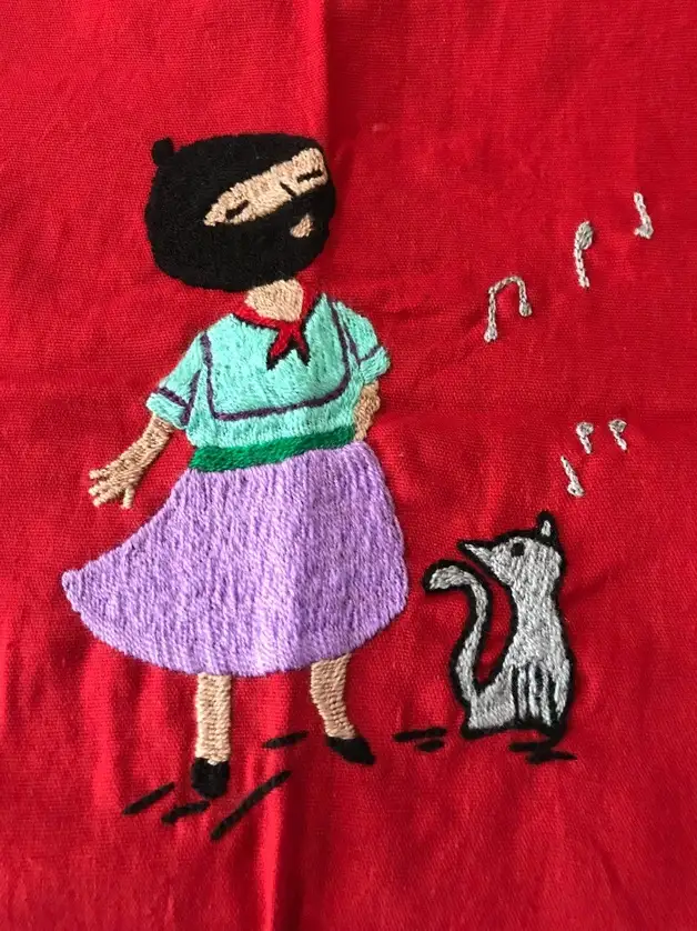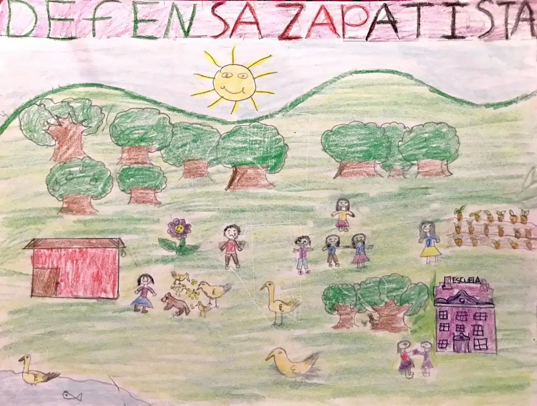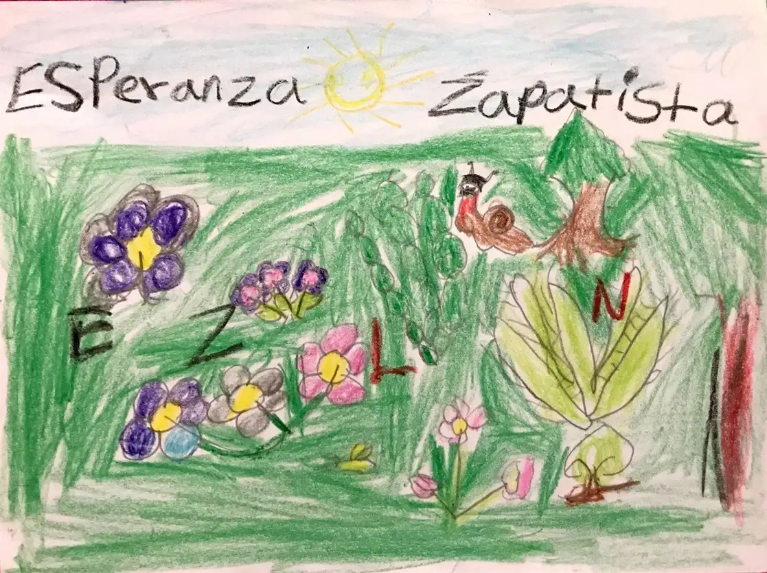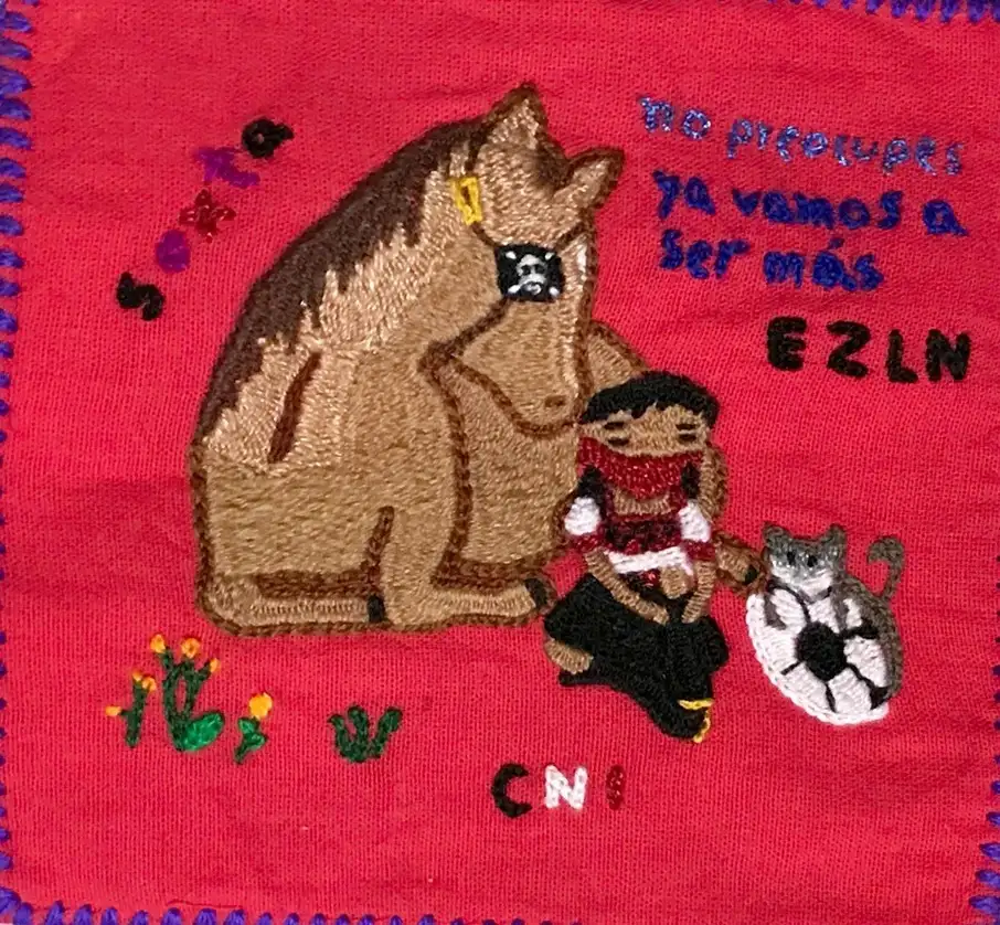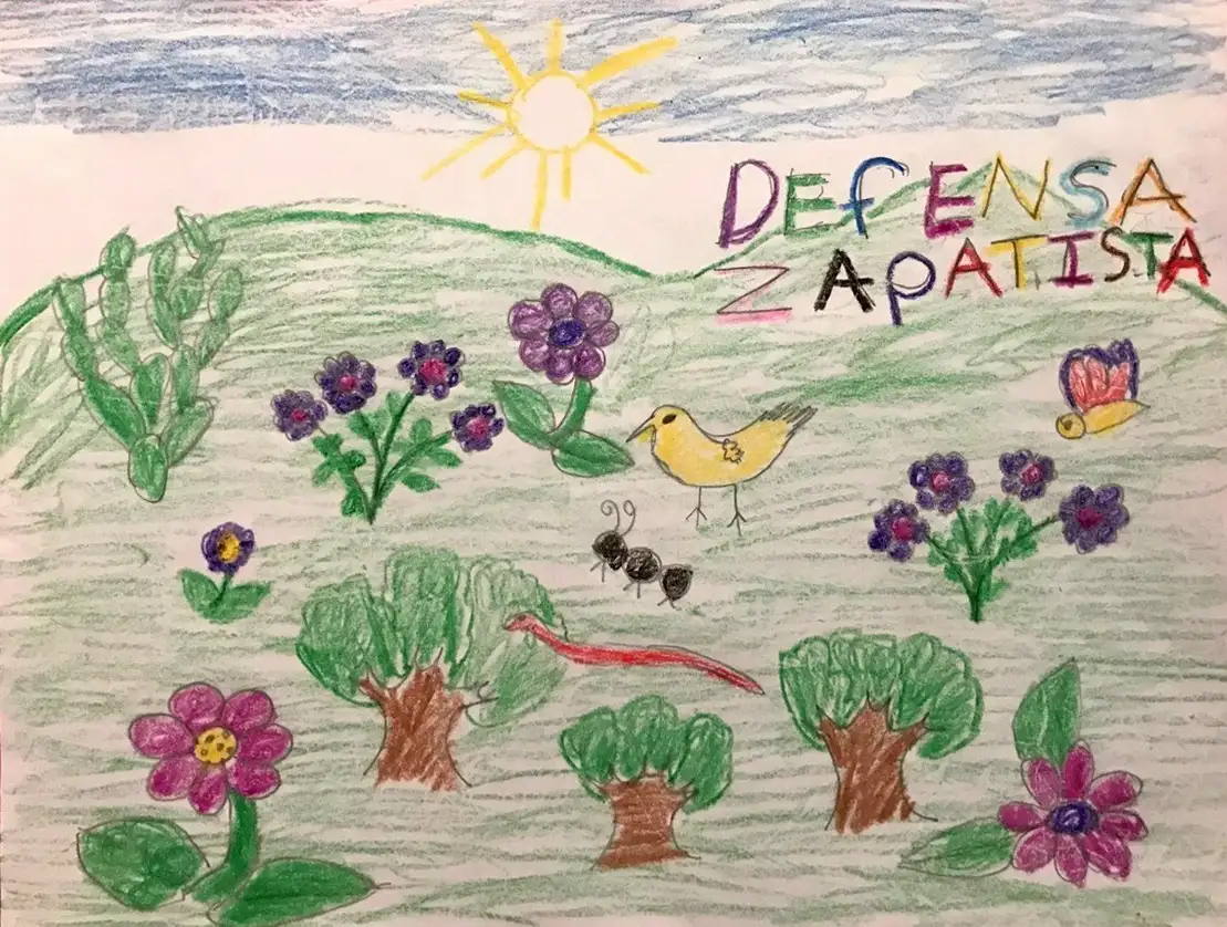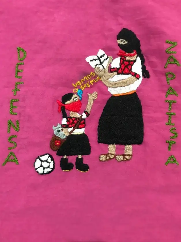 El texto literario incluye dibujos infantiles pintados a y fotografías de servilletas bordas con motivos tradicionales. “Arte, resistencia, colectivismo, autogobierno”, se lee en una de ellas.
