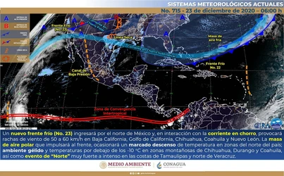 Asimismo, se mantendrá el ambiente de frío a muy frío en las mesas del Norte y Central, incluyendo el Valle de México, con temperaturas mínimas de -15 a -10 grados y heladas en las zonas montañosas de Chihuahua, Coahuila y Durango; de -10 a -5 grados con heladas en las cimas del norte de Aguascalientes, Baja California, el norte de Jalisco, Nuevo León, el occidente de San Luis Potosí, Sonora y Zacatecas; de -5 a 0 grados Celsius con heladas en las sierras del Estado de México, Guanajuato, Hidalgo, Puebla, Querétaro y Tlaxcala, y 0 a 5 grados Celsius con posibilidad de heladas en las zonas altas de Baja California Sur, Ciudad de México, el norte de Michoacán, el noroeste de Oaxaca y Veracruz.