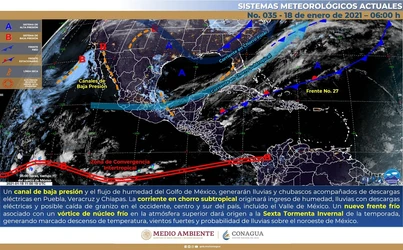 Ciudad de México. Este jueves, el Servicio Meteorológico Nacional (SMN) pronosticó ambiente de muy frío a gélido en el noroeste y norte de México, con posibles nevadas o aguanieve en Chihuahua y Sonora; temperaturas mínimas de -10 a -5 grados Celsius, se pronostican para las montañas de Chihuahua y Durango, y se esperan lluvias puntuales fuertes en Chihuahua y Sonora, debido a la Sexta Tormenta Invernal de la temporada, en interacción con el Frente Frío Número 30 y el arrastre de humedad que genera el Río Atmosférico Número 3.