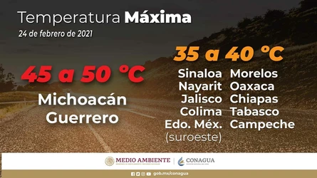 Este jueves, un sistema de alta presión que cubrirá el norte, occidente, centro y sur de México, así como la Península de Yucatán, ocasionará una onda de calor, baja probabilidad de lluvias y aumento gradual de las temperaturas máximas en la mayor parte del país. Por lo anterior, a lo largo del día se estiman temperaturas de 40 a 45 grados Celsius en zonas de Guerrero y Michoacán, y de 35 a 40 grados Celsius en Campeche, Chiapas, el suroeste de Coahuila, Colima, el suroeste del Estado de México, Jalisco, Morelos, Nayarit, el oriente de Nuevo León, Oaxaca, el suroeste de Puebla, Sinaloa, el sur de Sonora, Tabasco, el occidente de Tamaulipas y Yucatán.