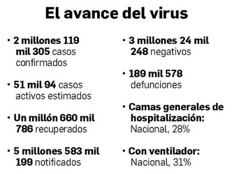Por lo que respecta a la disponibilidad hospitalaria, indicó que la tasa de ocupación a nivel nacional es de 28 por ciento para camas generales, mientras que en camas con ventilador es de31 por ciento. Indicó sólo la Ciudad de México y Puebla reportaron una ocupación del 50 por ciento en camas generales, mientras que en camas para pacientes críticos, la capital del país notificó una ocupación de 58 por ciento.