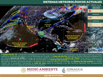El organismo de la Conagua también detalló que el frene frío 44 propicia fuertes rachas de viento en Baja California, Baja California Sur, Chihuahua, Coahuila, Nuevo León, Zacatecas, Aguascalientes y San Luis Potosí; agregó que un canal de baja presión recorrerá el interior del territorio causando rachas lluvias con carga eléctrica al centro de México.