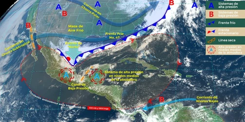 Ciudad de México. El Servicio Meteorológico Nacional informó que el frente frío 49 se extenderá al norte de la República Mexicana para interactuar con una línea seca y la corriente en chorro subtropical, lo que mantendrá el clima caluroso al noreste, oriente, occidente, sur y sureste de México, incluida la Península de Yucatán. Se prevén temperaturas de ente 40 y 45 grados Celsius en Campeche, Chiapas, Guerrero, el norte de Hidalgo, Michoacán, Oaxaca, el norte de Puebla, Quintana Roo, San Luis Potosí, Tabasco, Tamaulipas, Veracruz y Yucatán.