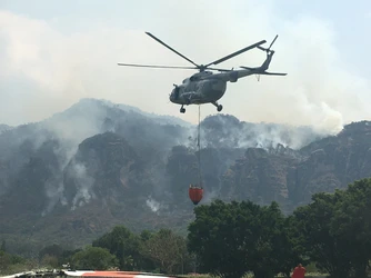 Por segundo día consecutivo los helicópteros siguen con sus labores de descarga de agua para combatir el fuego en las zonas más altas de los cerros de Tepoztlán.