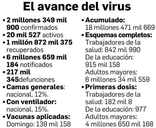 Hasta el domingo, se reportó que 12 millones 625 mil 860 personas han recibido al menos una de las inyecciones; representan 10 por ciento de la población. Ese día se aplicaron 139 mil 158 vacunas y del total, 7 millones 792 mil 707 corresponden a personas que ya cuentan con el esquema completo de una o dos dosis.