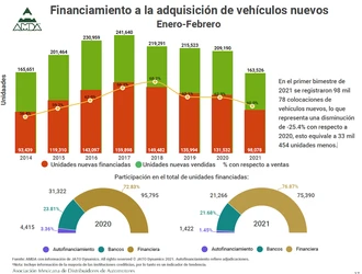 Por tipo de financiamiento, los de Marca (vinculadas a los fabricantes) tuvieron una participación de mercado de 76.9% con 121 mil 306 automotores; Bancos 21.6% y 34 mil 104; mientras que Autofinanciamiento mantuvo el 1.5% con 2 mil 403 unidades.