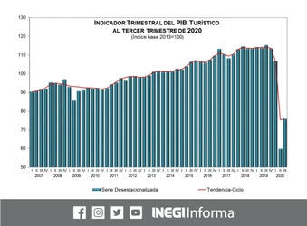 El PIB turístico cayó entre octubre y diciembre pasados 26.9 por ciento anual. El dato se compone de las bajas de 27.6 por ciento en la producción de servicios y de 23.4 por ciento en los bienes.