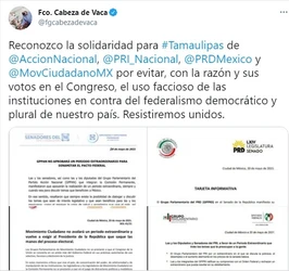 ese mecanismo buscará un acuerdo político que evite una crisis constitucional de varios días en Tamaulipas. Una opción, señaló, podría ser que el aún gobernador pida licencia.