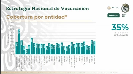 A la fecha, 36 por ciento de las personas de 18 años y más en el país ya recibieron al menos una dosis anti-Covid. Baja California tiene el mayor porcentaje de población adulta vacunada, tras concluir su campaña de inmunización. Le sigue la Ciudad de México, con 53 por ciento, y Baja California Sur, con 50 por ciento.