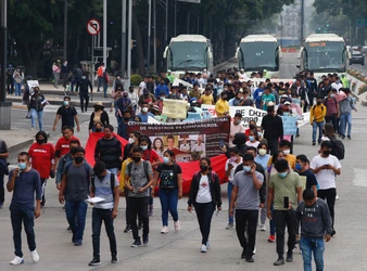 Un grupo de estudiantes de la Escuela Normal Rural de Mactumactzá, Chiapas, marcharon este martes del Ángel de la Independencia al Zócalo para exigir la libertad incondicional de casi cien de sus compañeros, así como de integrantes de organizaciones solidarias que siguen bajo proceso debido a las manifestaciones de semanas recientes en exigencia de exámenes de ingreso presenciales.