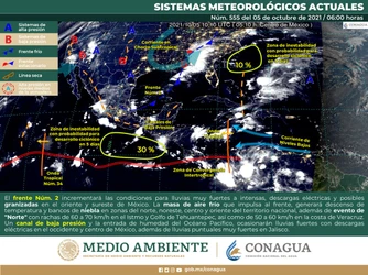 Ciudad de México. Este jueves, de acuerdo con información del Servicio Meteorológico Nacional (SMN) el frente número 2 se encontrará estacionario sobre el sureste de México, y en interacción con la Onda Tropical Número 35 provocará lluvias torrenciales (de 150 a 250 milímetros [mm]) en Campeche, Chiapas, Tabasco y el sur de Veracruz; intensas (de 75 a 150 mm) en Oaxaca, y muy fuertes (de 50 a 75 mm) en Quintana Roo y Yucatán, así como viento del norte con rachas de 60 a 70 kilómetros por hora (km/h) en el Golfo e Istmo de Tehuantepec y oleaje de 1.5 a 2.5 metros (m) de altura en dicho golfo; rachas de 50 a 60 km/h en la costa centro y sur de Veracruz, y condiciones para trombas frente a las costas de Campeche, Tabasco y el sur de Veracruz.