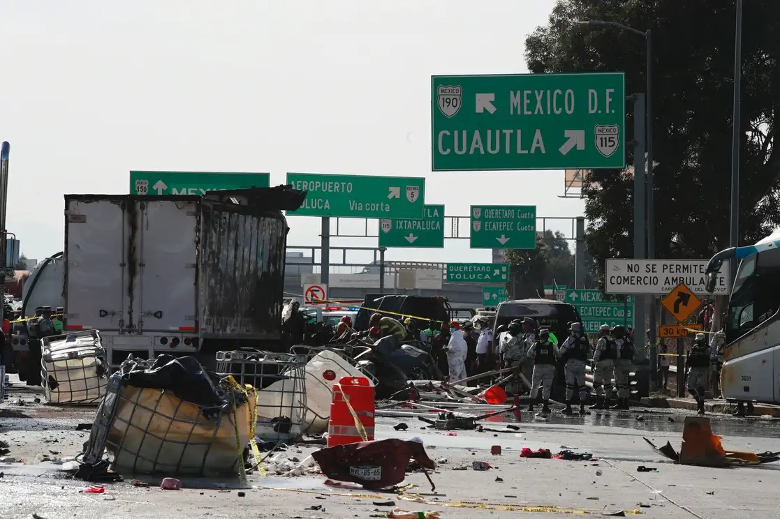 Chalco, Méx. Un tractocamión con caja seca se quedó sin frenos y embistió a una decena de vehículos que intentaban cruzar la caseta de cobro San Marcos Huixtoco de la autopista México-Puebla. La pesada unidad se incendió y el fuego se propagó a varios de los autos accidentados. Se reporta la muerte de 19 personas y 3 lesionados. Entre los fallecidos se encuentra el chofer de la unidad.