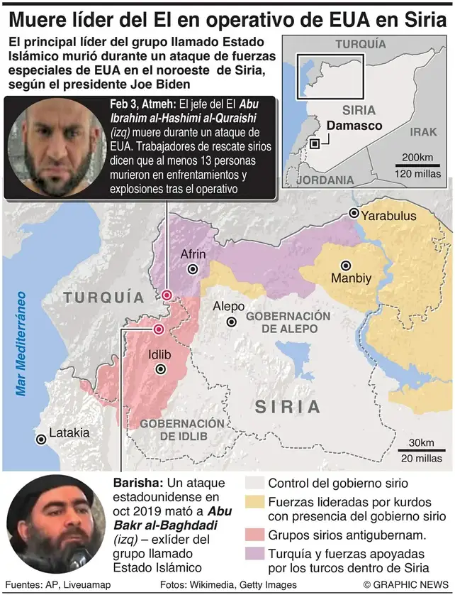 El principal líder del grupo llamado Estado Islámico, Abu Ibrahim al-Hashimi al-Qurayshi, murió durante un ataque de fuerzas especiales de Estados Unidos, realizado en el noroeste de Siria, según informó el presidente estadunidense, Joe Biden. Vía Graphic News