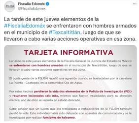 La Fiscalía General de Justicia del Estado de México (Fgjem) realiza las investigaciones para aclarar los hechos. En la zona fueron levantados varios cartuchos percutidos.