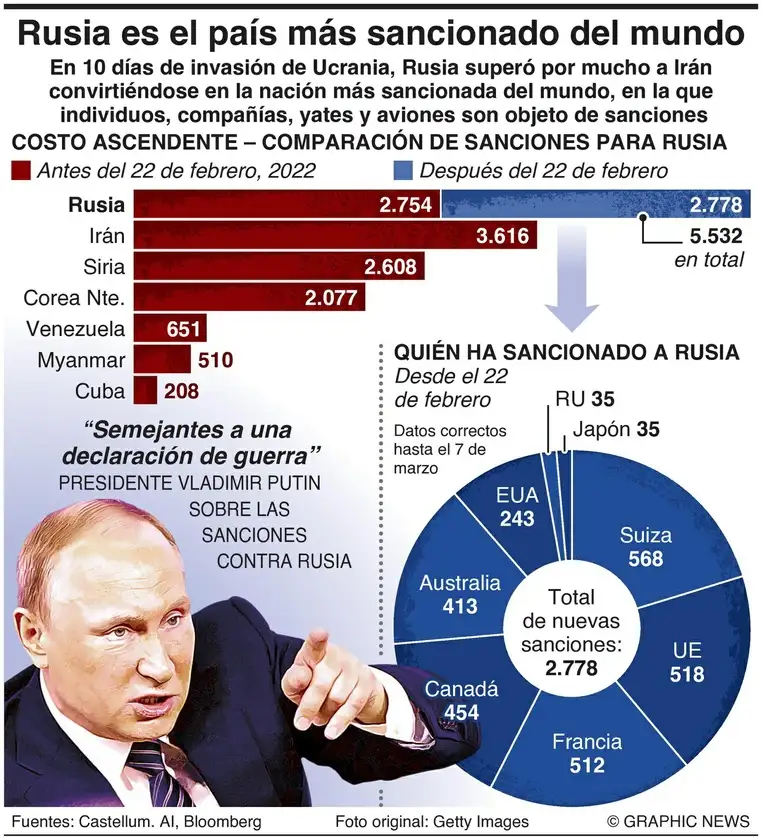 En 10 días de invasión de Ucrania, Rusia superó por mucho a Irán al convertirse en la nación más sancionada del mundo, en la que individuos, compañías, yates y aviones son objeto de amonestaciones. Vía Graphic News