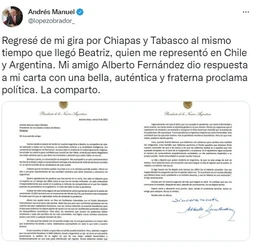 “La carta que le envié a mi amigo Alberto Fernández y ayer con mi esposa Beatriz, que me representó en Argentina y en Chile, me entregó esta carta y consideré importante darla a conocer porque está muy bien escrita, él es muy sincero, muy honesto, es una muy buena proclama política, es su concepción, coincido con él en casi todo. Sólo pienso que independientemente de esta alianza en nuestra América debe buscarse la integración de toda América”, dijo.