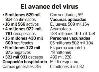 Además, cuatro millones 927 mil 029 personas se han recuperado de la enfermedad desde que se registró el primer caso en México.