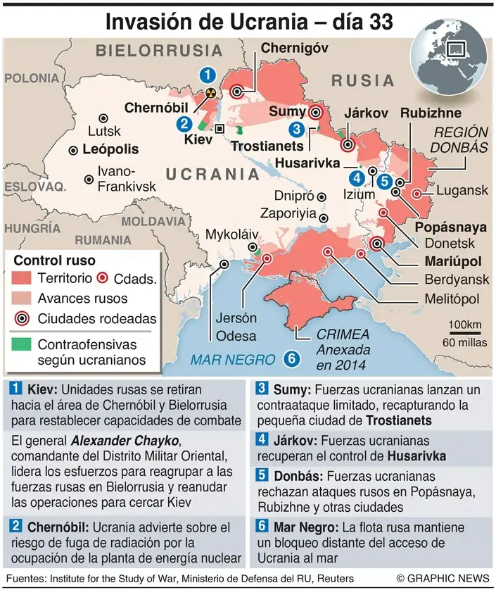 Ucrania afirma que está haciendo retroceder a los rusos, que están estancados en la ofensiva de Kiev, mencionando zonas como Stoyanka, que está a medio kilómetro del límite occidental de la capital ucraniana.