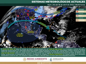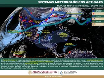 También, añadió, se esperan viento con rachas de 60 a 80 kilómetros por hora (km/h) y tolvaneras en Baja California, Durango, Nuevo León, Tamaulipas y Zacatecas, con posible formación de torbellinos en Chihuahua y Coahuila, así como viento con rachas de 50 a 60 km/h en Aguascalientes, Baja California Sur, en zonas costeras del estado de Campeche, Guerrero, Jalisco, Michoacán, San Luis Potosí, Sinaloa, Sonora, las costas de Yucatán y el Istmo y Golfo de Tehuantepec.