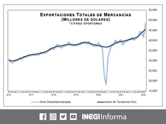 En abril, el valor de las exportaciones de mercancías fue de 47 mil 479 millones de dólares, cifra integrada por 43 mil 655 millones de dólares de exportaciones no petroleras y por 3 mil 825 millones de dólares de petroleras.