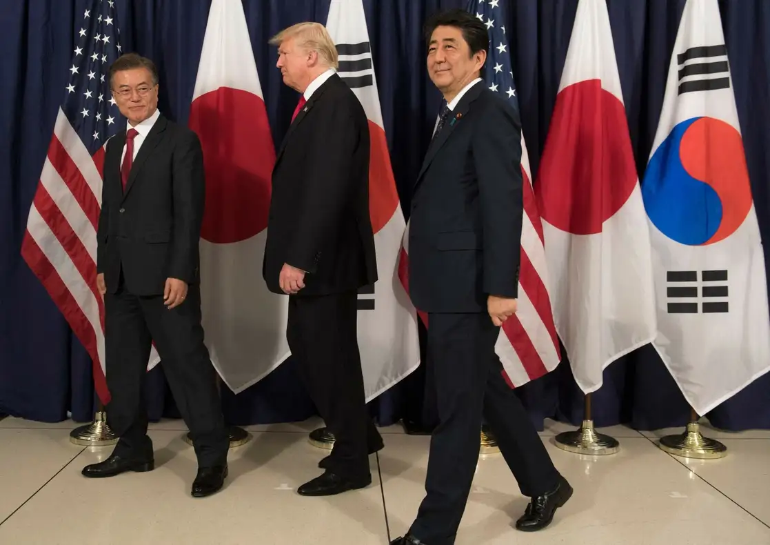 El presidente de los Estados Unidos, Donald Trump (centro); el primer ministro japonés, Shinzo Abe (derecha); y el presidente de Corea del Sur, Moon Jae-in, previo a la Cena de Seguridad del Noreste de Asia en el Consulado General de los Estados Unidos en Hamburgo al margen de la Cumbre del G2, el 7 de julio de 2017. Foto Afp