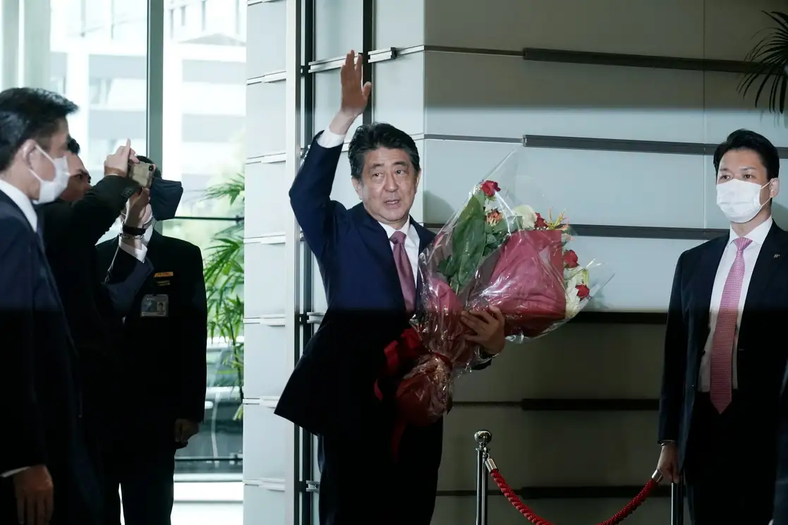 Shinzo Abe saluda al dejar la oficina del primer ministro en Tokio, 16 de septiembre de 2020. Foto Ap