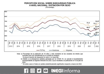 Ciudad de México. En el segundo trimestre del año se registró una percepción de inseguridad de 63.7 por ciento en la Ciudad de México, que colocó a esta entidad con 3.7 puntos por debajo de la media, de 67.4, de acuerdo con la Encuesta Nacional de Seguridad Pública Urbana del Instituto Nacional de Estadística y Geografía (Inegi).
