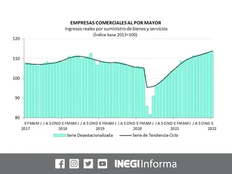 En mayo de 2022 y a tasa anual, los ingresos reales por suministro de bienes y servicios al por mayor incrementaron 6.0 por ciento, lo que representó una desaceleración anual con relación a abril.