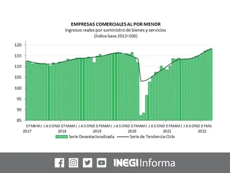 De acuerdo con el Instituto Nacional de Estadística y Geografía (Inegi), los ingresos reales por suministro de bienes y servicios de las empresas comerciales al por menor se ubicaron en 119.2 puntos, lo que representó un avance de 0.5 por ciento en mayo, con respecto al incremento de 0.5 por ciento de abril, con cifras desestacionalizadas para hacer más comparable los periodos.