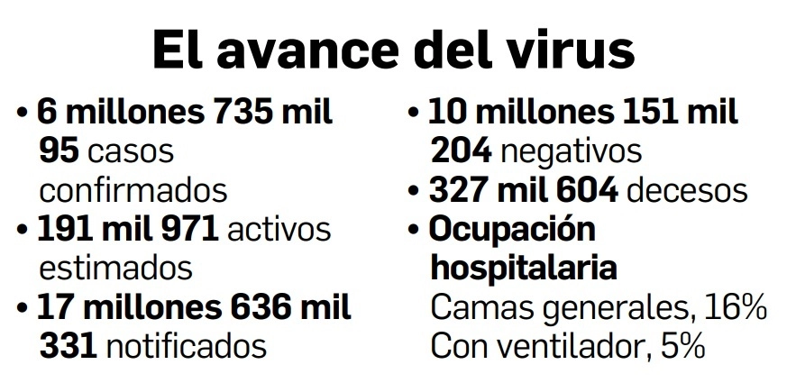 Ciudad de México. Al mantenerse la tendencia a la baja en los casos confirmados de covid-19 en México, la Secretaría de Salud (Ssa) reportó ayer 23 mil 248 contagios, con lo que 6 millones 735 mil 95 personas han dado positivos al virus del SARS-CoV-2, mientras los decesos se elevaron en 79, con un acumulado de 327 mil 604.