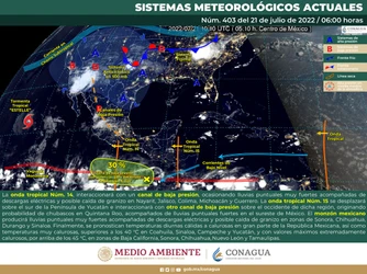 Las condiciones atmosféricas son generadas por el Monzón mexicano sobre el noroeste del país; el avance de la Onda Tropical Número 18 sobre la Península de Yucatán y el sureste mexicano; canales de baja presión en el interior del país, en combinación con la entrada de humedad del Océano Pacífico y el Golfo de México.