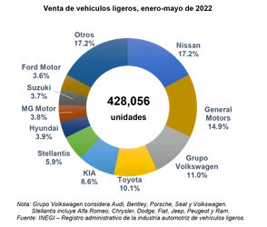 En los primeros siete meses del año, la industria automotriz en México comercializó 601 mil 563 unidades, 0.2 por ciento (mil 118 vehículos) menos que los que se reportaron al cierre de julio de 2021.