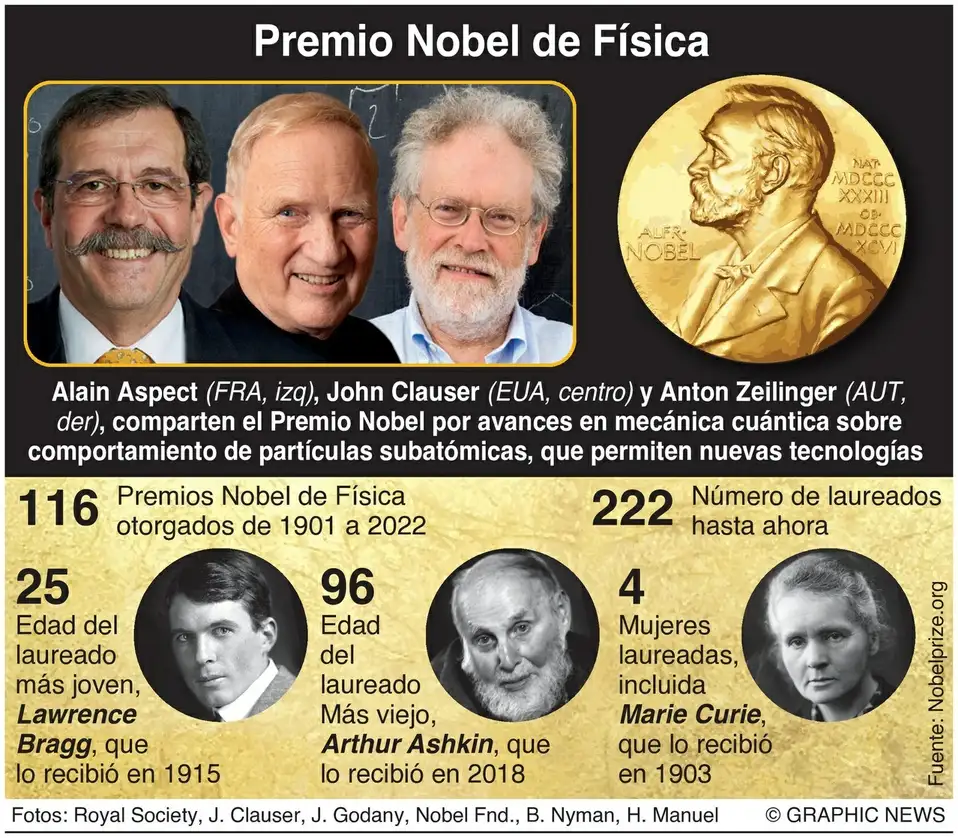 Los científicos Alain Aspect, John Clauser y Anton Zeilinger ganaron el Premio Nobel de Física por avances en mecánica cuántica sobre comportamiento de partículas subatómicas, abriendo el camino para el trabajo en supercomputadoras y comunicación encriptada. Vía Graphic News