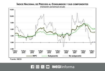 Más temprano, el Instituto Nacional de Estadística y Geografía (Inegi) informó que la inflación de México en la primera quincena de agosto bajó a 4.67 por ciento, en línea con las expectativas del mercado, y la subyacente, que muestra la trayectoria de la inflación en el mediano y largo plazos, bajó más de lo esperado por los analistas, a 6.21 por ciento.